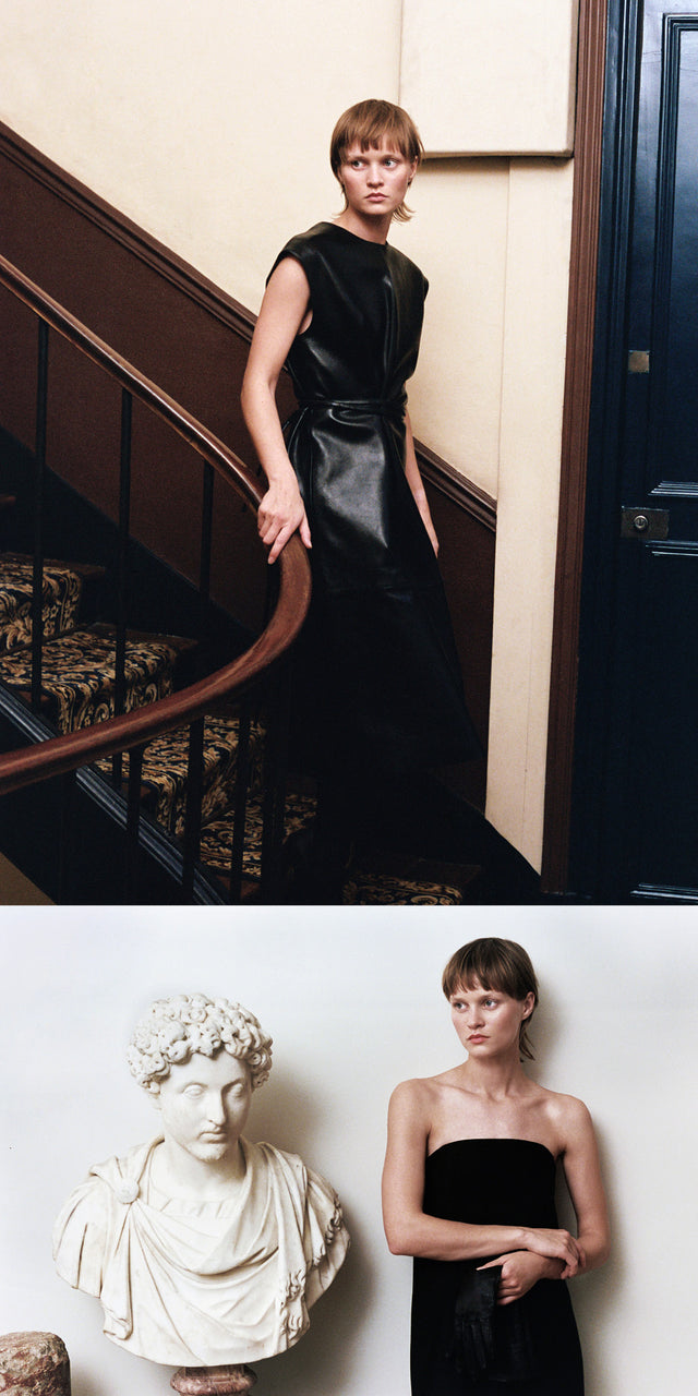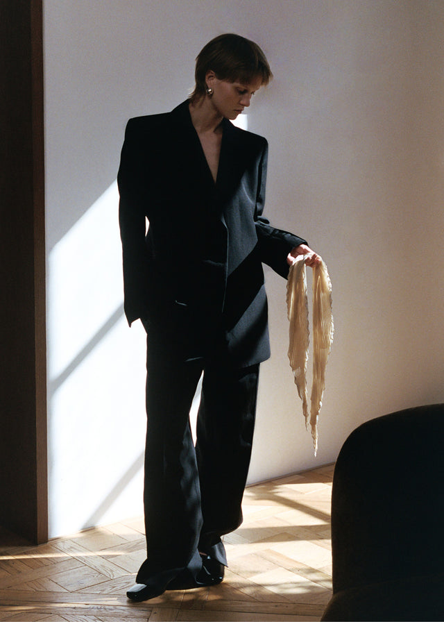An oversized suit taken from the male wardrobe appears alongside a pared-down strapless wool dress. Shearling warms the body, while leathers glow in deep olive green or glossy black. Fine-gauge knits glide softly over the skin. Ivory Théa pumps, the Suzanna patent leather bag and a pleated silk scarf complete this sophisticated and understated look.